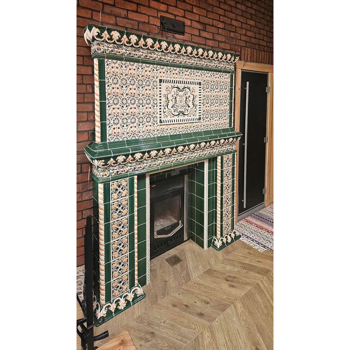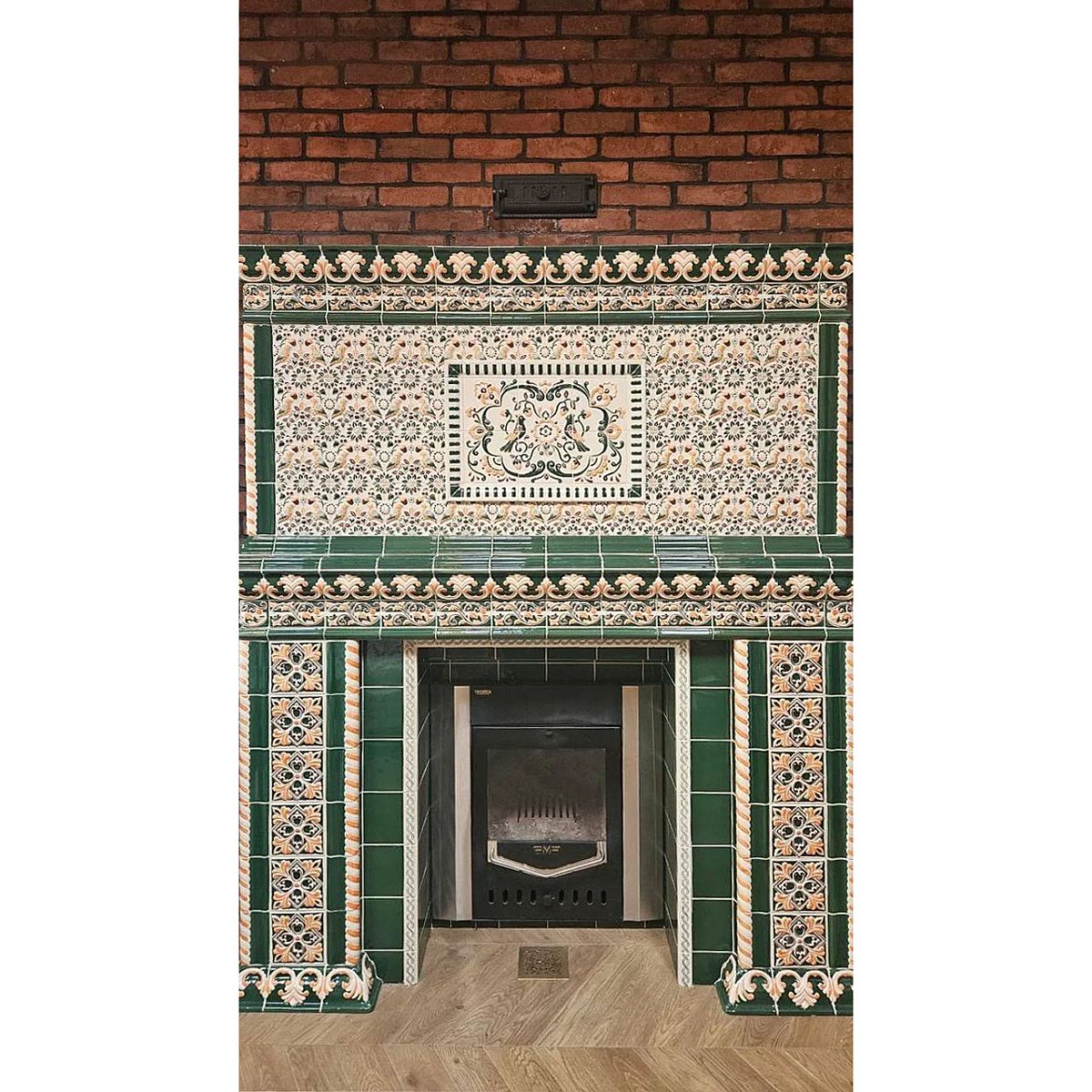 Портал банной печи в облицовке изразцами коллекции Птички.