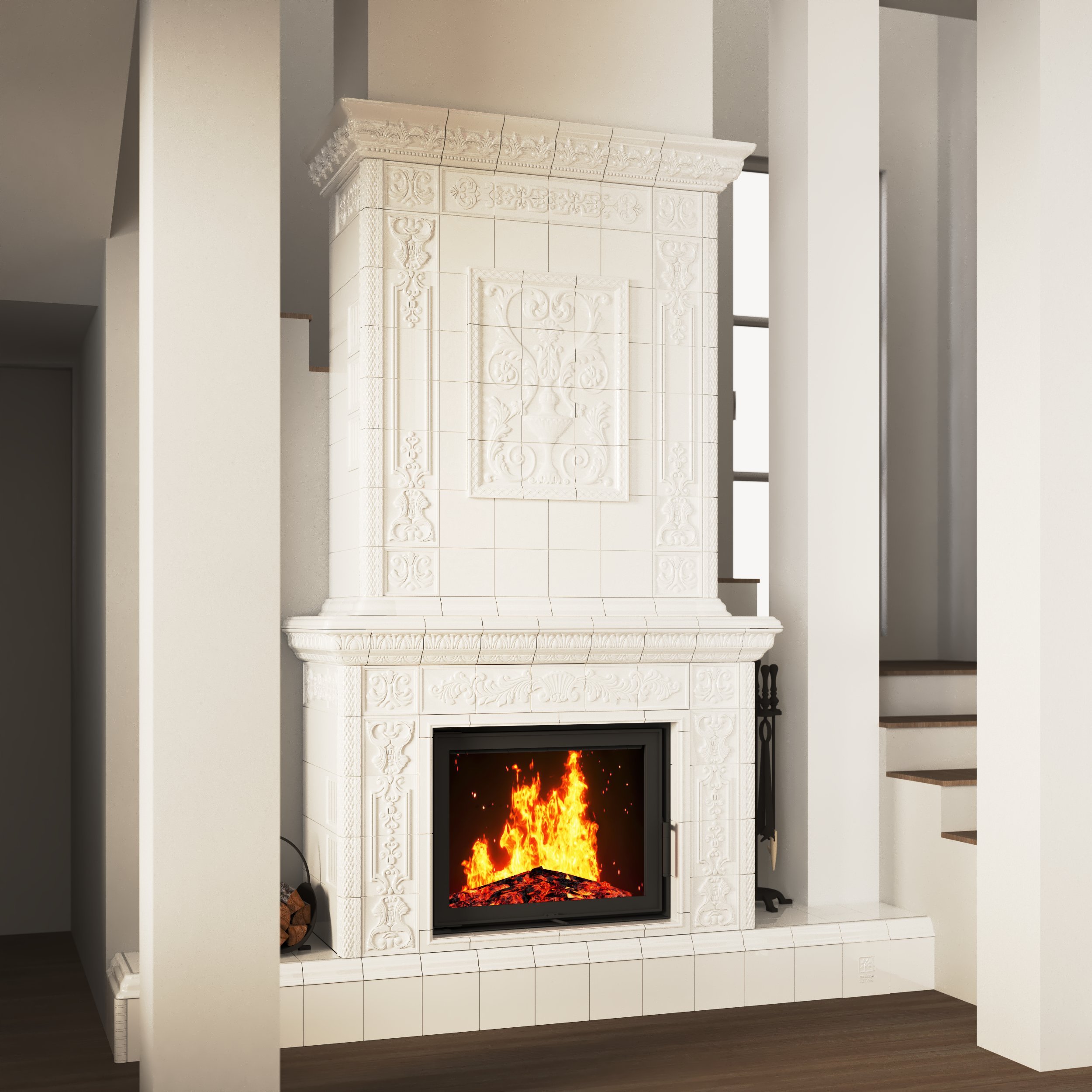 • камин в эксклюзивной изразцовой облицовке ручной работы.